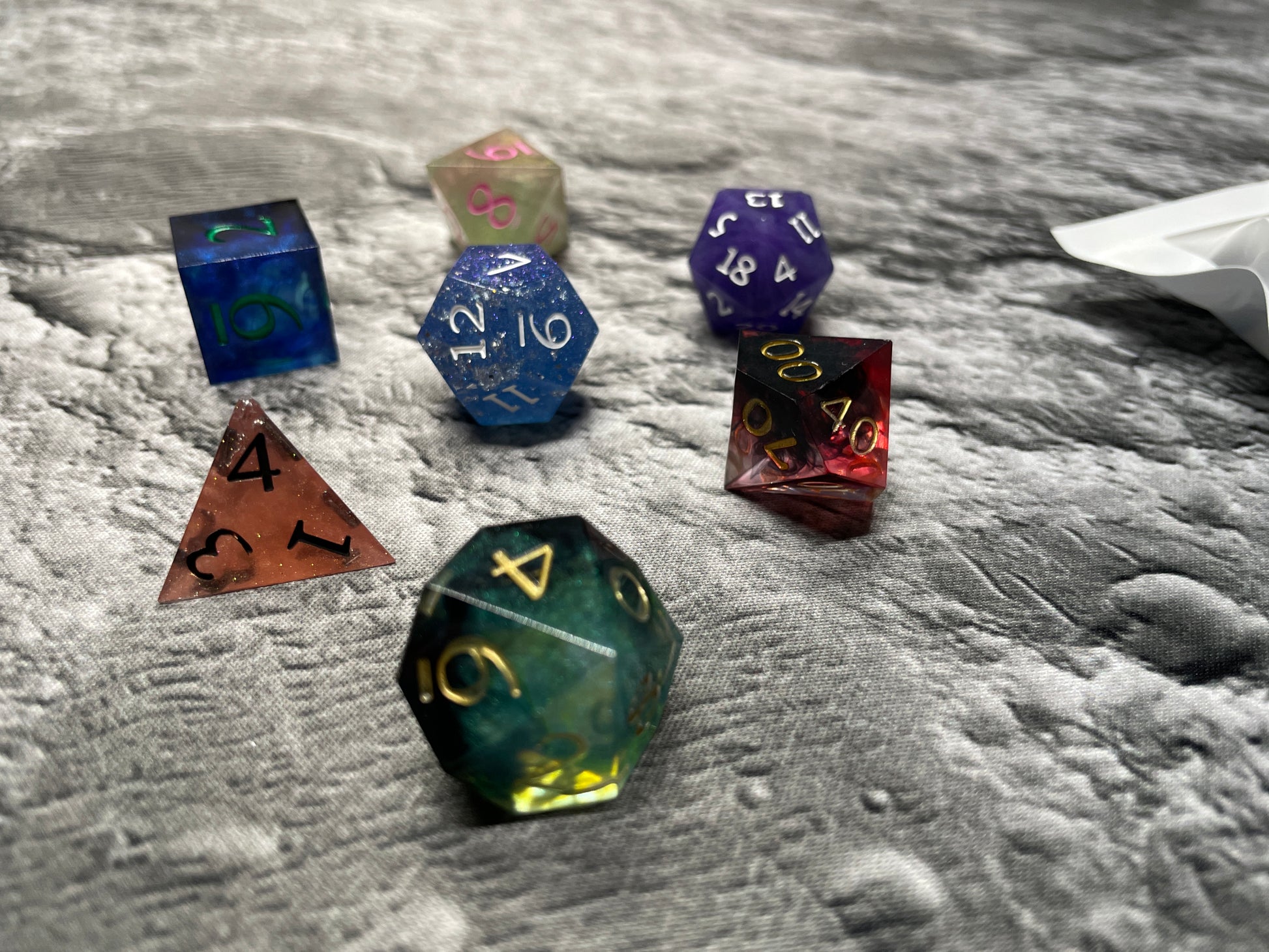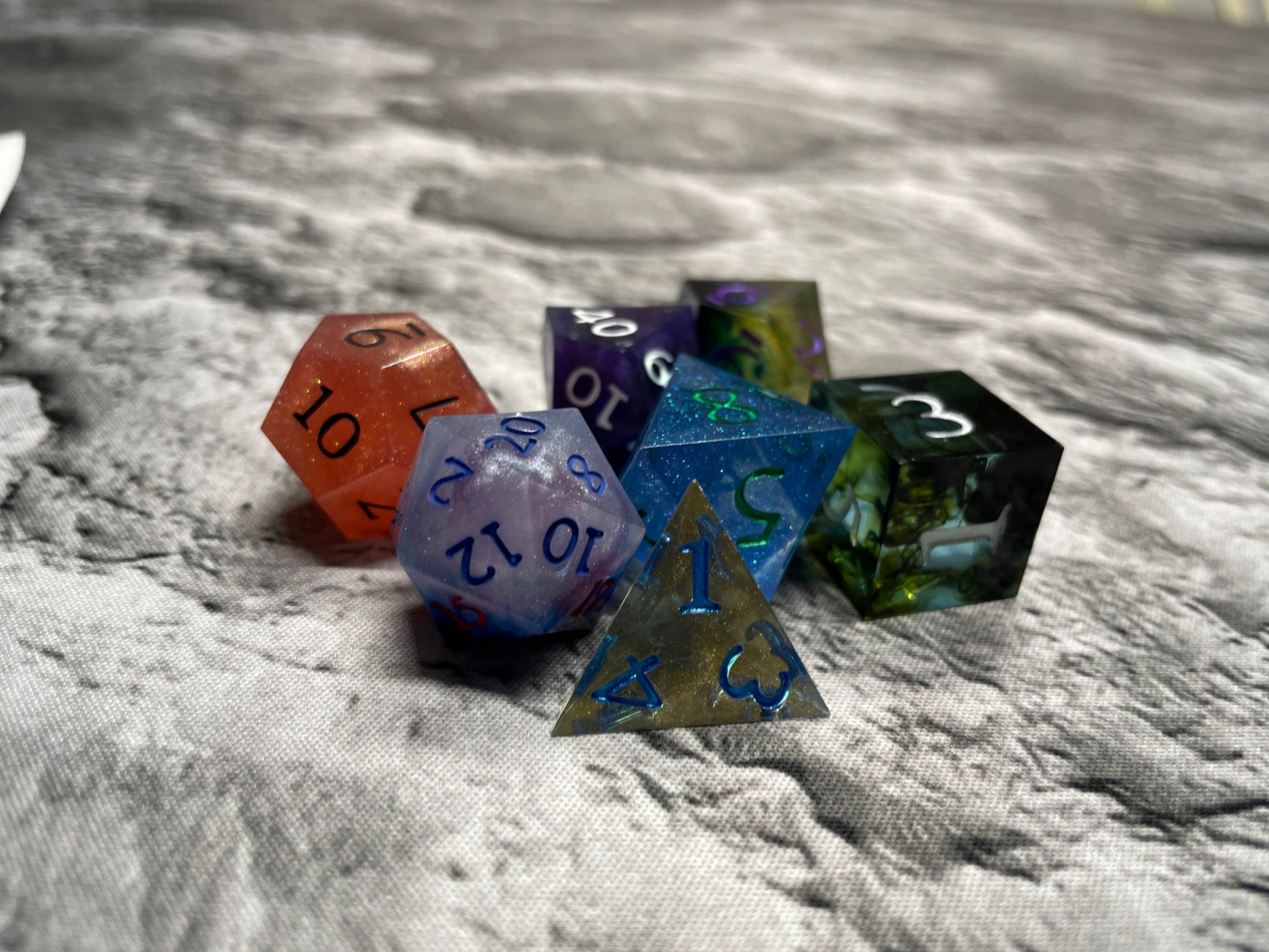 Made by the Hungry Barbarian himself these dice are unique blend of colors. Each 18mm polyhedral set comes with 7 dice (d4, d6, d8, d10, d10 (00-90), d12, and d20).