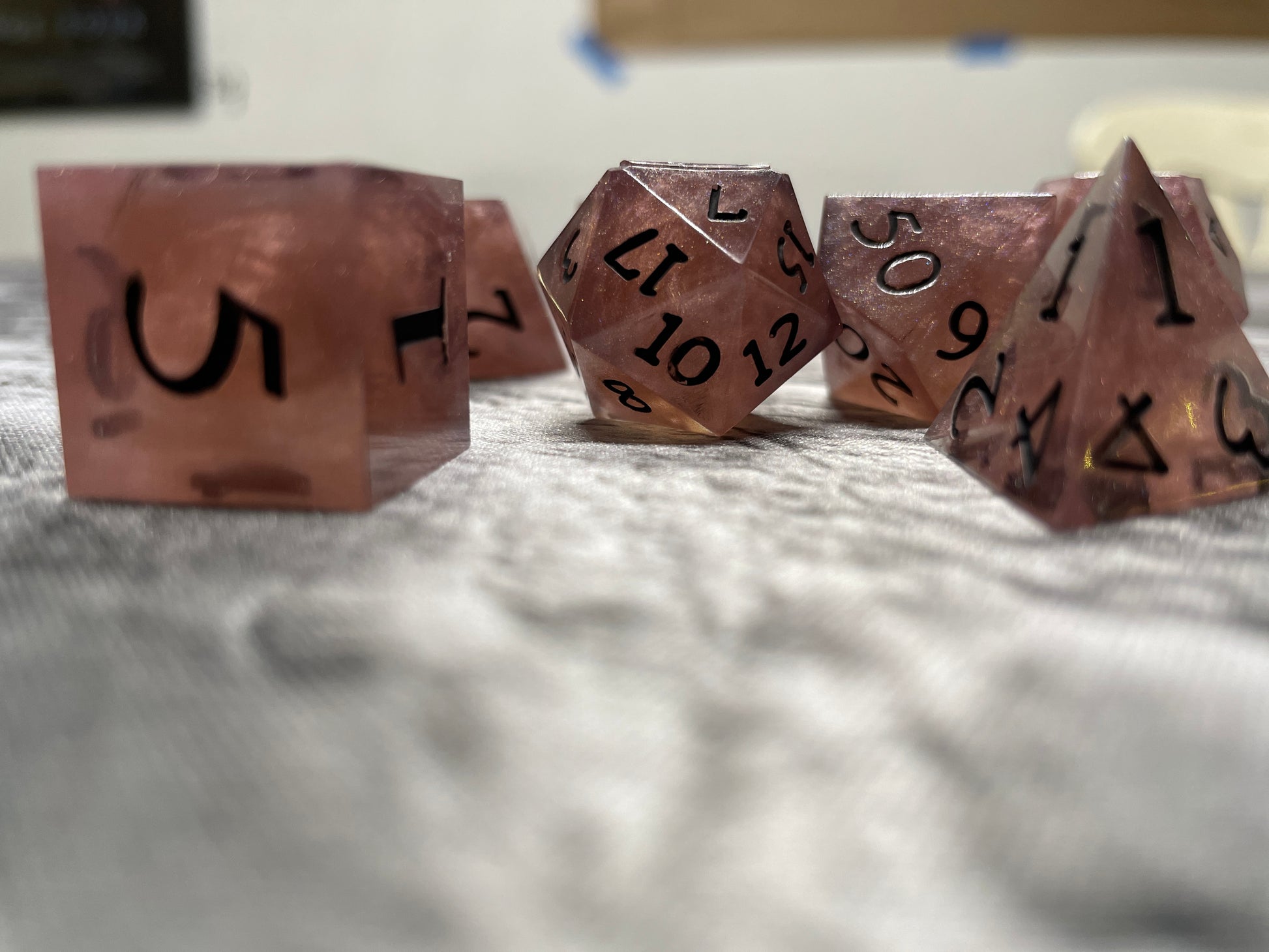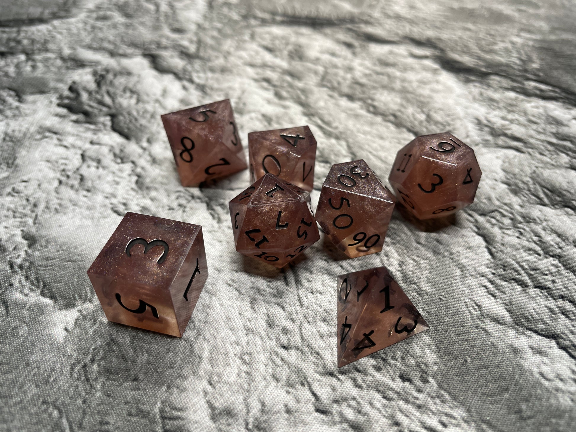 Made by the Hungry Barbarian himself these dice are unique blend of colors. Each 18mm polyhedral set comes with 7 dice (d4, d6, d8, d10, d10 (00-90), d12, and d20).