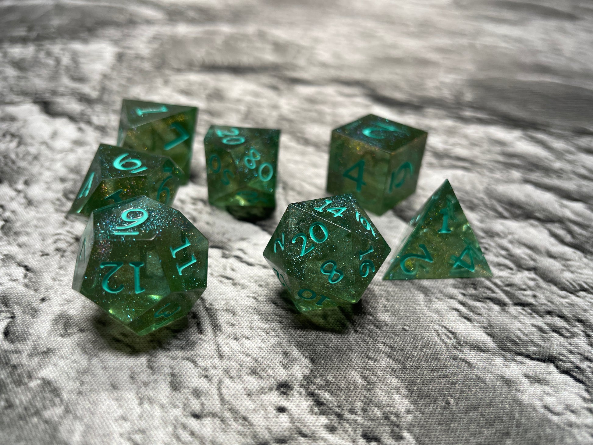 Made by the Hungry Barbarian himself these dice are unique blend of colors. Each 18mm polyhedral set comes with 7 dice (d4, d6, d8, d10, d10 (00-90), d12, and d20).