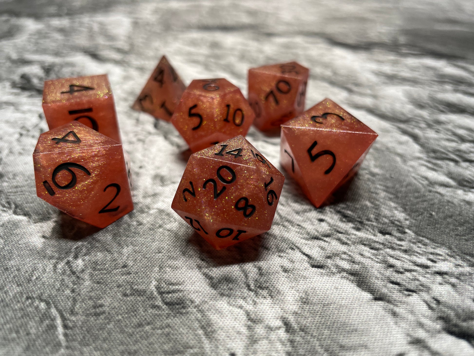 Made by the Hungry Barbarian himself these dice are unique blend of colors. Each 18mm polyhedral set comes with 7 dice (d4, d6, d8, d10, d10 (00-90), d12, and d20).