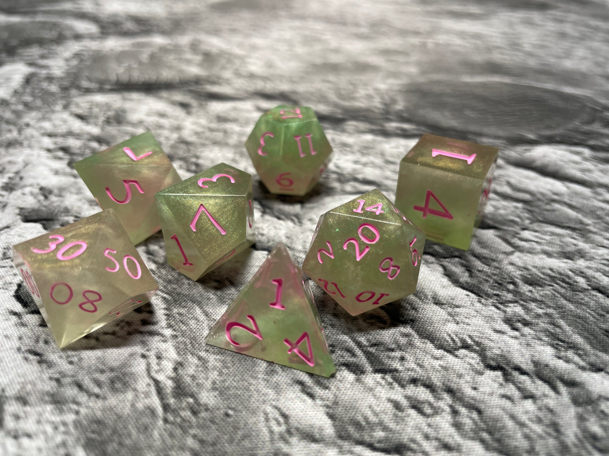 Made by the Hungry Barbarian himself these dice are unique blend of colors. Each 18mm polyhedral set comes with 7 dice (d4, d6, d8, d10, d10 (00-90), d12, and d20).